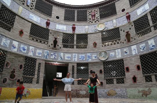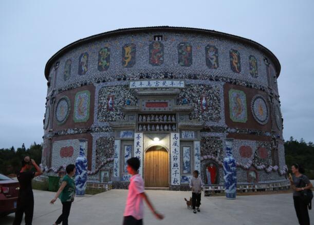 这形似土楼的圆形建筑,里里外外都贴满了瓷片瓷器,密密麻麻。从一楼到三楼的,陈列着瓷板画等各种瓷艺作品。